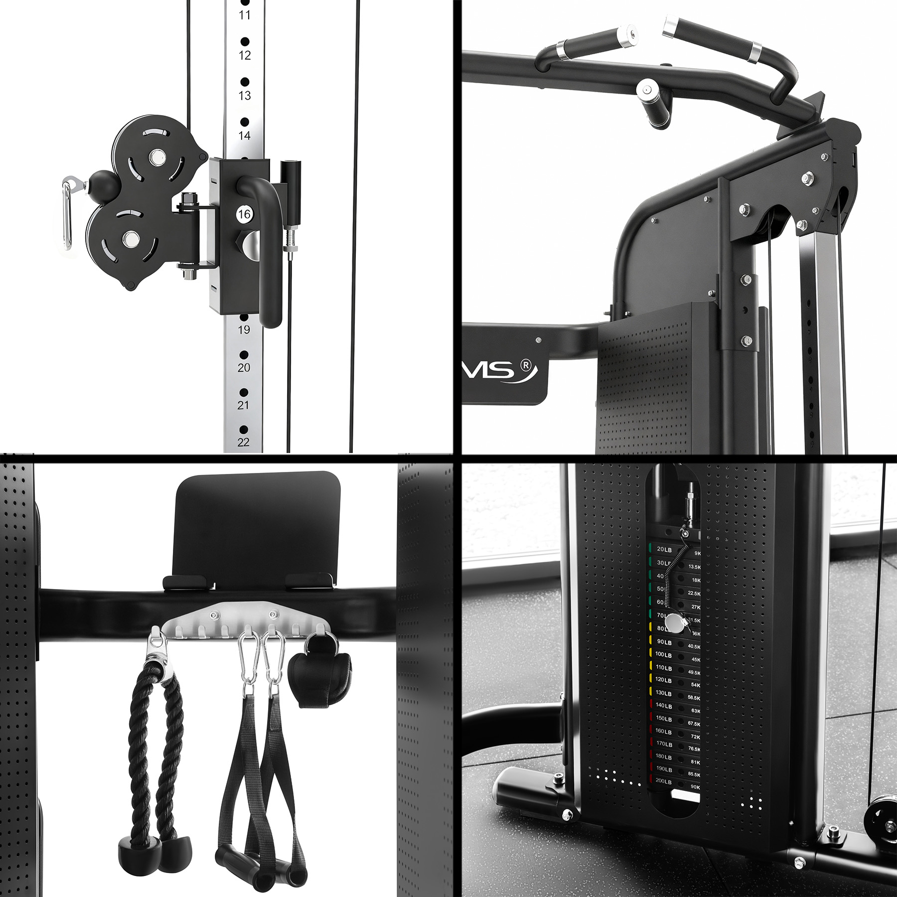 Az edzőkeret két független súlycsomaggal van felszerelve, amelyek mindegyike 90 kg-ot nyom. A mágneses csapok gyors és pontos terhelésválasztást tesznek lehetővé, a kiváló minőségű kábelek és alumínium csigák pedig a dinamikus edzések során is zökkenőmentes működést biztosítanak.
